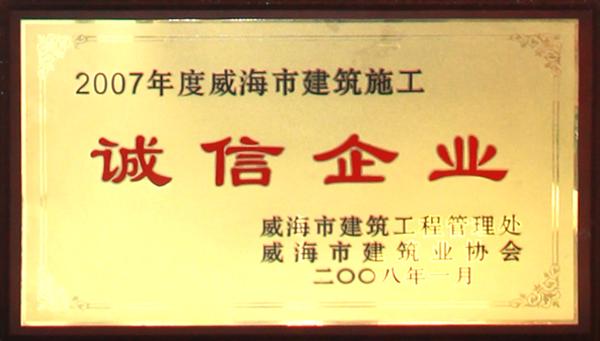 公司連續(xù)八年榮獲威海市“誠(chéng)信開(kāi)發(fā)企業(yè)”、“建筑施工誠(chéng)信企業(yè)”,連續(xù)九年被評(píng)為威海市級(jí)“守合同重信用企業(yè)”,多次被評(píng)為威海市“市級(jí)文明單位”、“質(zhì)量管理先進(jìn)企業(yè)”、 “安全管理先進(jìn)企業(yè)”,乳山市“優(yōu)秀企業(yè)”、“先進(jìn)民營(yíng)企業(yè)”、“納稅明星企業(yè)”,在社會(huì)上逐步樹(shù)立了誠(chéng)信、穩(wěn)健的企業(yè)形象。